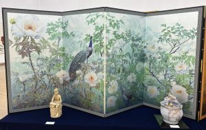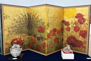 写真家・小川勝久氏の屏風とともに作品が展示されています。